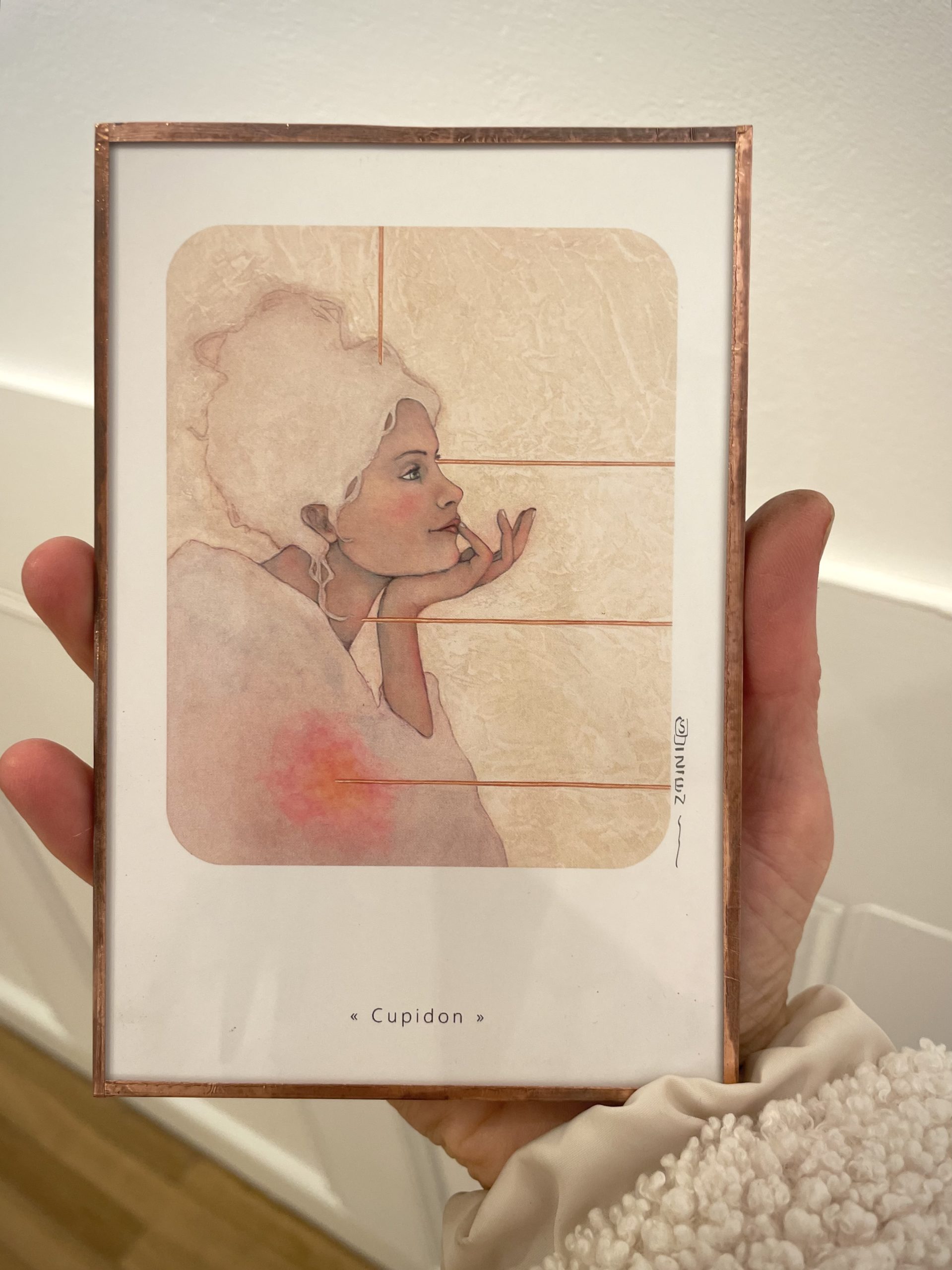 Encadrement fixe sous verre format 10 x 15 cm, bordé de cuivre oxydé, doté d’une attache au dos.